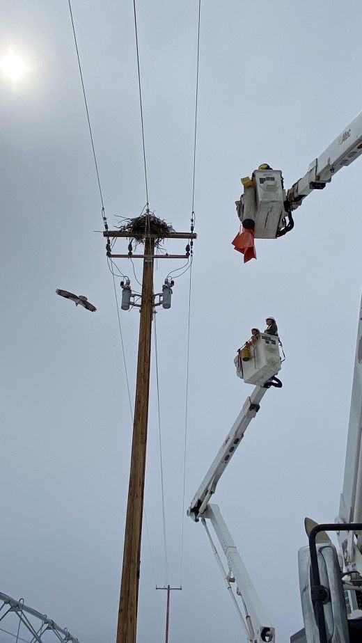 Moving day in early May was snowy and 27 degrees. NorthWestern Energy crews first erected a pole with a nest platform nearby after receiving permission from the landowner. Line crews then reached the nest on the energized pole with a bucket truck and the female osprey flew away, keeping an eye on their activity.