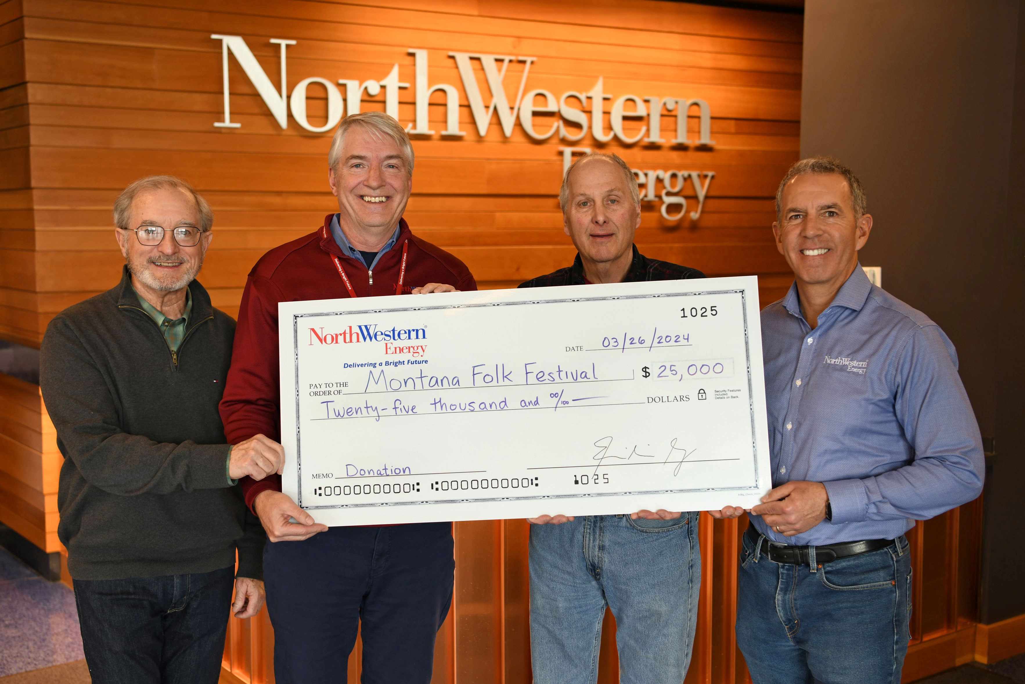 NorthWestern Energy presents the company’s donation for the 2024 Montana Folk Festival, left, Mainstreet Uptown Butte President Tom Staples, NorthWestern Energy President and CEO Brian Bird, Mainstreet Uptown Butte Executive Director George Everett and NorthWestern Energy Community Relations Manager Paul Babb